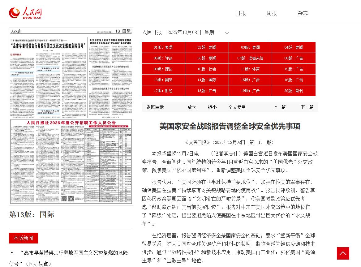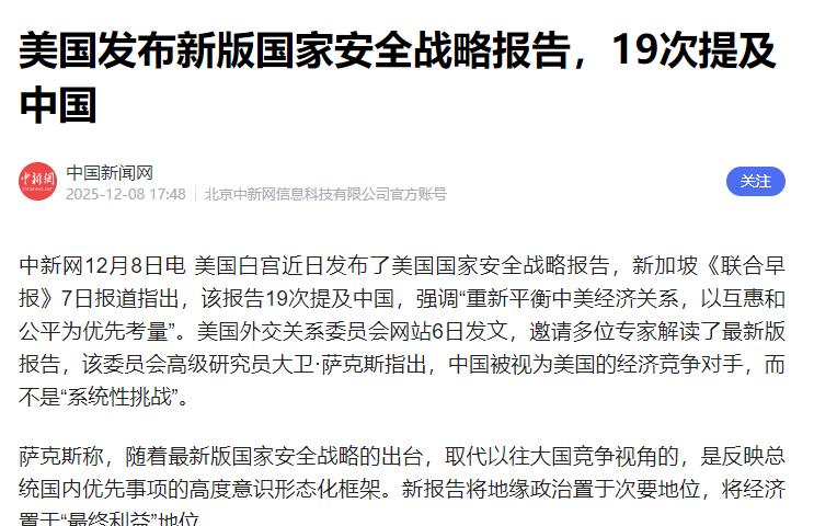 2025年12月,美国白宫发布最新《国家安全战略报告》。