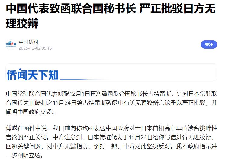 2025年11月,中国常驻联合国代表正式提交照会,将日本对台海的军事表态定性为"对二战后国际秩序的系统性挑战"。