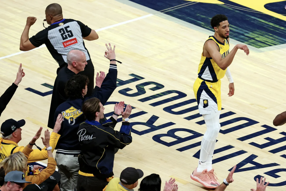 要知道,G3在本赛季对于步行者而言一直是不幸的存在。在前三轮比赛,步行者在G3中无一例外地遭遇失利,首轮面对雄鹿16分落败,次轮面对骑士22分输球,东决面对尼克斯6分憾负,他们看起来在转换场地过后总会出现整体疲软。如今步行者总算用赛场表现,打破了G3的不胜魔咒,凯特琳-克拉克在场边做出哈利伯顿模仿雷吉-米勒的锁喉动作,用来致敬步行者两个时代的两名球星,而雷吉-米勒也恰好在场边共同观赛。