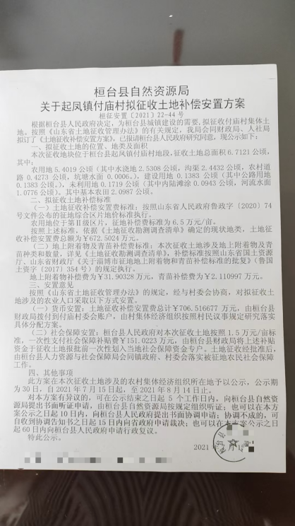 时间回到2021年,付庙村因当地建设规划需求,部分村民的承包地被依法纳入征收范围。彼时,当地自然资源部门发布的《土地征收补偿安置方案》写得明明白白:土地补偿安置费总额672万余元,地上附着物及青苗补偿费34万余元,还有151万余元的社会保障补贴费——这笔钱,是给被征地村民的“养老钱”“救命钱”,方案里更明确要求“专款专用、全程公开,社保补贴划入专户”。