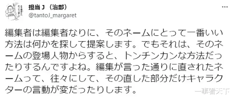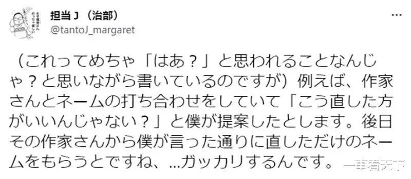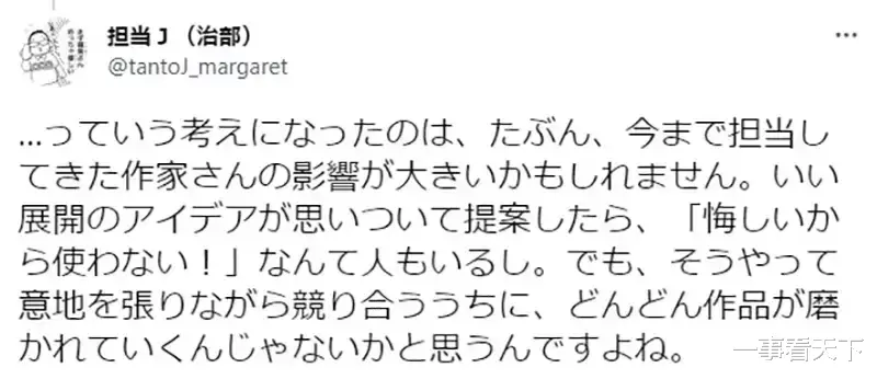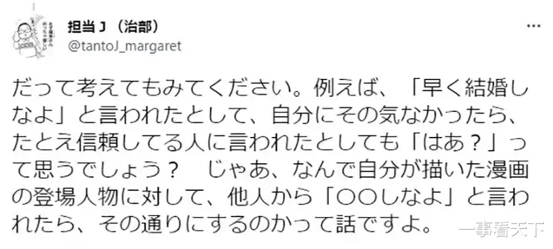 围绕这个话题,日本集英社漫画杂志《玛格丽特》的编辑治部智宏最近在推特上发表了一些观点,引发了众多争议。让我们一起看看,他是如何阐述这个问题的吧~