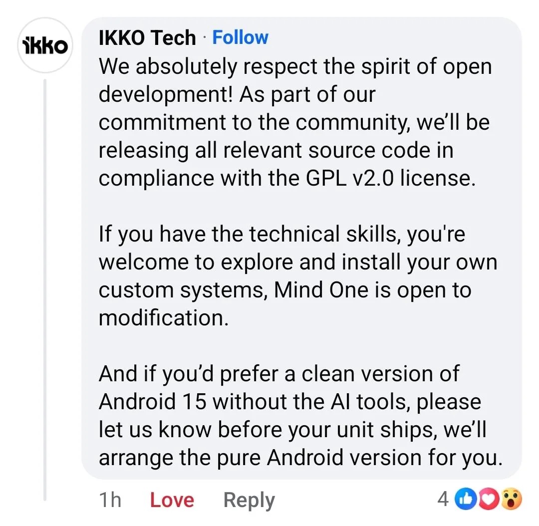 官方信息显示,其AI功能并非系统底层能力,而是一个名为“iKKO AI”的,可以被用户自行安装或卸载的独立应用程序。