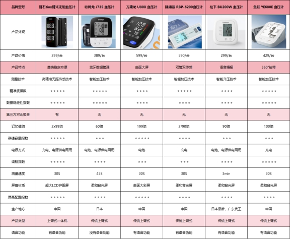 说真的,挑东西的时候光听介绍挺不靠谱的,还是得先过一遍表格数据,心里才踏实一点。你懂的吧,总不能靠“感觉”选。所以咧,这次把参与测评的几款血压计都乖乖排进表格里了,数据摆在这,看着就省心。