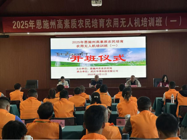 【通讯员 熊契 廖兆琳 罗秋霞】2025年10月11日,恩施州高素质农民培育农用无人机培训班在武汉华莘科技有限公司巴东仙池峰无人机培训基地正式开班。本次培训由恩施州农业农村局主办,武汉华莘科技有限公司承办,计划培育学员120名,分2个班先后开展系统教学,旨在培养一批掌握无人机技术的“新农人”,推动农业现代化发展,为恩施州低空经济与智慧农业注入新动力。