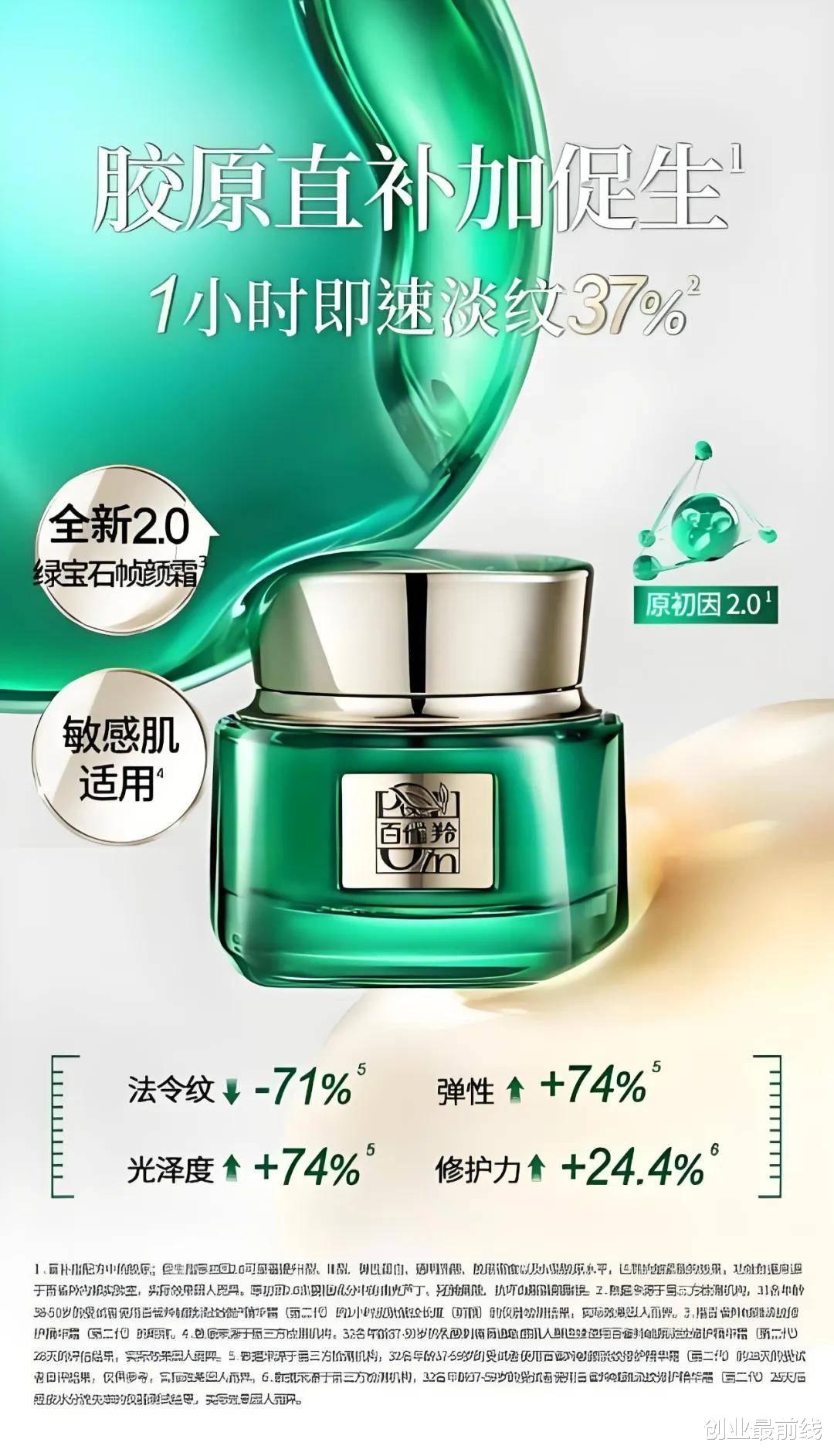 此前,百雀羚曾通过在《歌手2024》植入广告、邀请明星代言等方式,持续宣传绿宝石帧颜霜能“1小时快速淡纹28%”。「界面新闻·创业最前线」记者此前也在微信朋友圈中,看到相关广告。