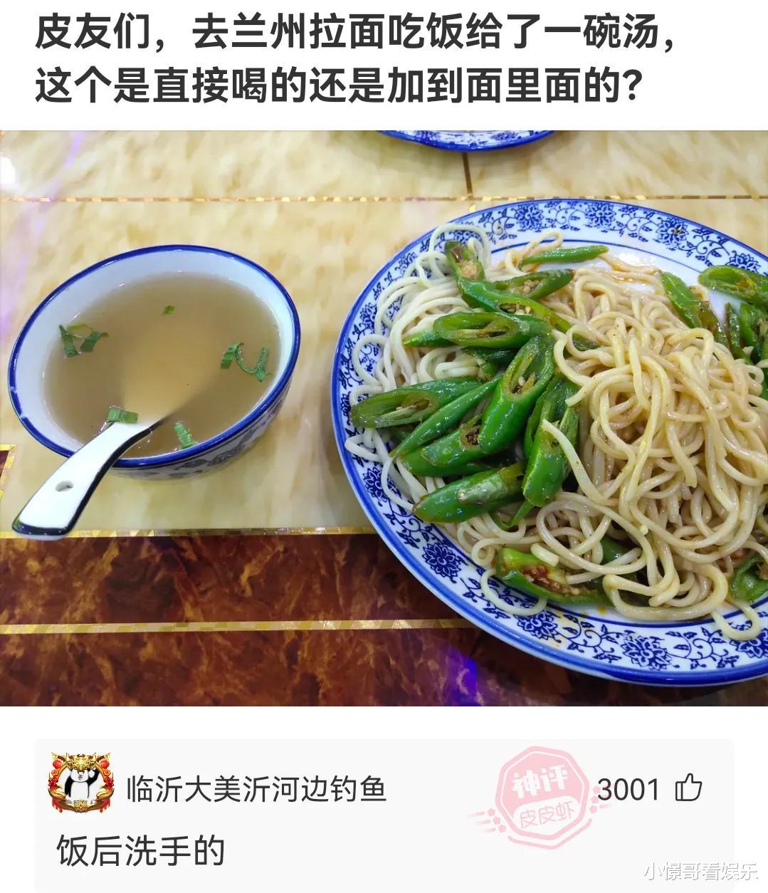 跟你科普一下,先把汤扣倒头上,在原地跺三脚,仪式完毕,才开始吃面。