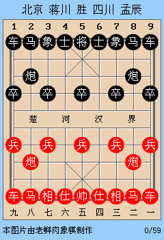 第四局蒋川先手,布局沿用了第二局的仙人指路右中炮对卒底炮飞左象。次序上蒋川稍加改动,八路炮率先点进下二线,辗转腾挪架上天地炮。同时二路车避兑,见缝插针也深入敌方腹地。最终弃车入局一举拿下胜利。此后的三局中,孟辰稳扎稳打,纵使蒋川用尽浑身解数仍未能有所进取,棋局悉数成和。