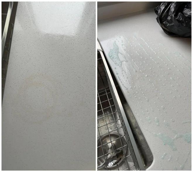 于是,网上一查发现用84可以,本着试一试的想法,将纸巾用84浸湿敷到台面染色处,大概两个多小时后,台面就还原了,果然中国人不骗中国人。