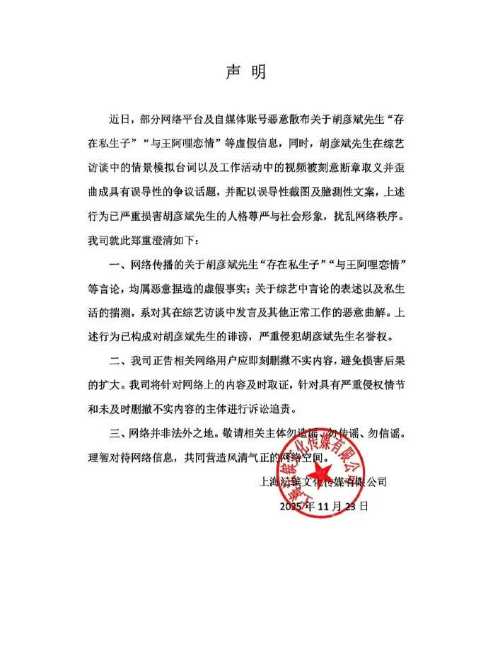 11月23日,胡彦斌工作室突然发布严正声明,直接驳斥近期网络上流传的“胡彦斌存在私生子”及“与王阿哩恋情”等传闻,称这些言论均属“恶意捏造的虚假事实”。
