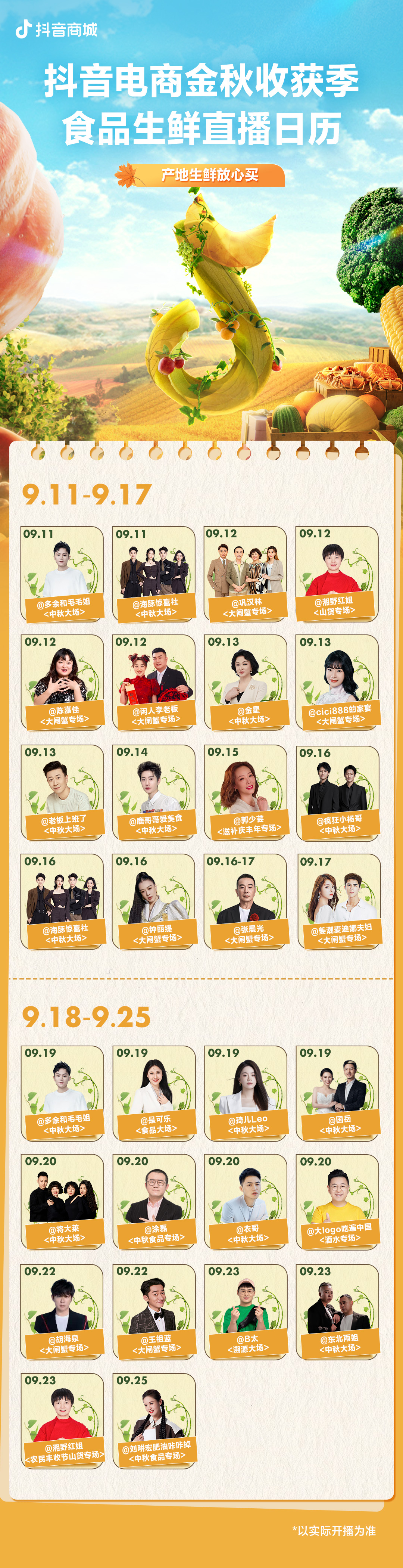 为了帮助消费者们获得全方位的种草体验,确保真材实料,抖音电商金秋收获季联合@刘畊宏肥油咔咔掉、@朱梓骁、@金星、@贾乃亮、@疯狂小杨哥、@海豚惊喜社 等众多明星主播和头部达人,在平台持续长达三周的大场直播。