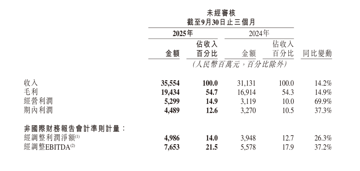11月19日,快手发布截至2025年9月30日的第三季度未经审计财报。期内,快手实现总营收355.54亿元,同比增长14.2%;经营利润为52.99亿元,同比增长69.9%;期内利润为44.89亿元,同比增长37.3%;经调整利润净额为49.86亿元,同比增长26.3%,。