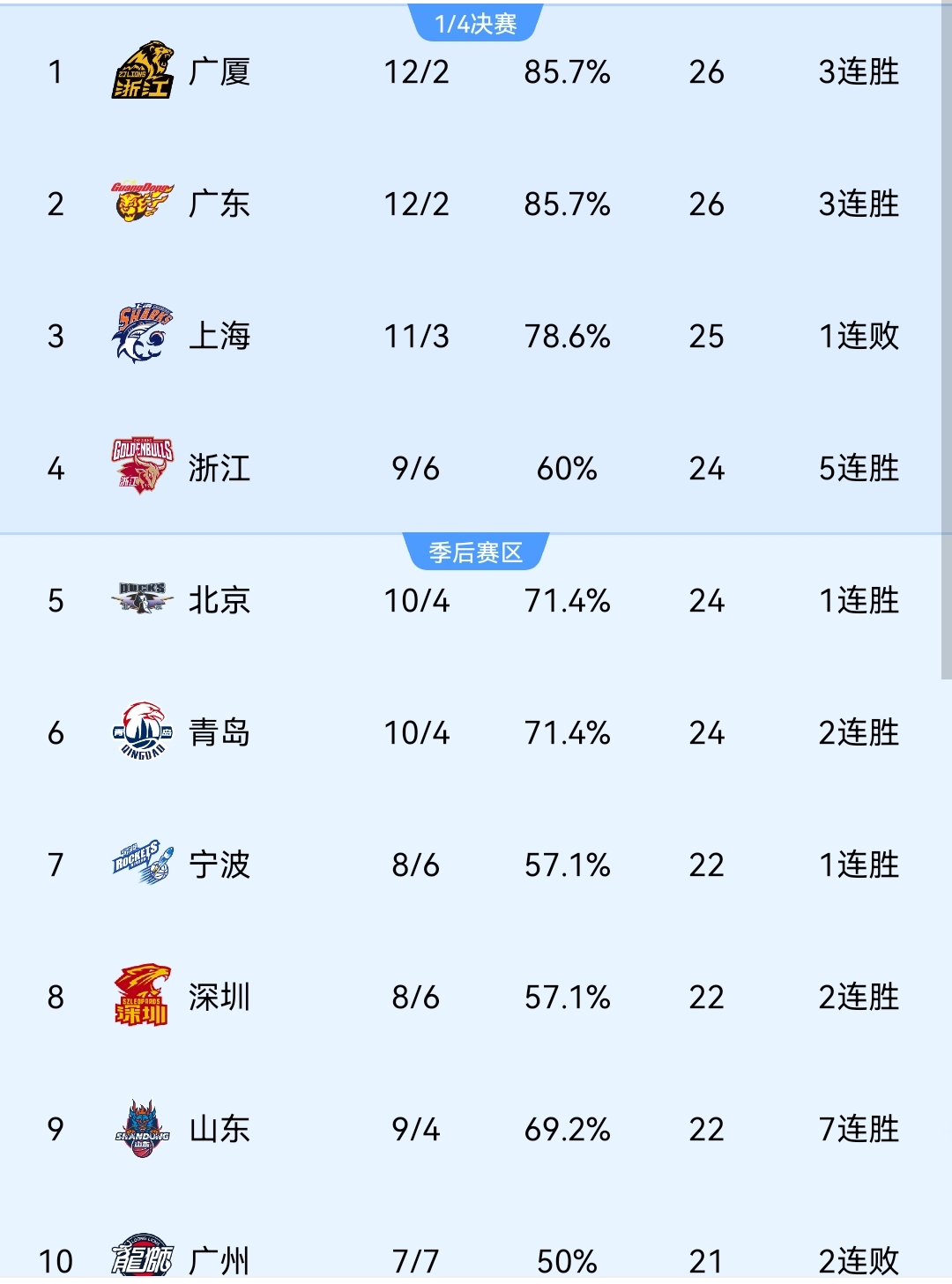 第四节两队效率不高,半节过去了,浙江得到9分,广州只有4分入账。分差也来到13分。最终主队保住胜势,以89-74战胜广州,豪取五连胜,排名暂时来到了第四位。