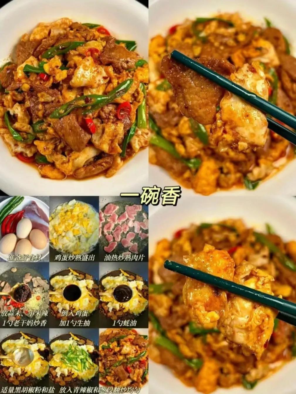 辣椒、鸡蛋、肉片一起爆炒,看着普通,味道却特别香。接地气的名字,超下饭的口感,一上桌就被抢光。
