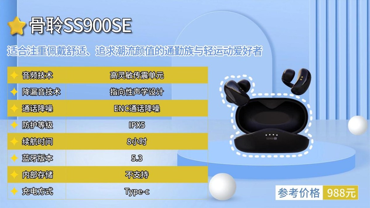 总结:骨聆SS900SE以迷你骨传导振子、出色音质、低漏音与全能实用配置为核心优势,兼顾佩戴舒适与使用便捷性。对于注重音质表现、追求无负担佩戴,且有日常通勤与轻运动需求的用户而言,是兼具技术实力与使用体验的高端优选。