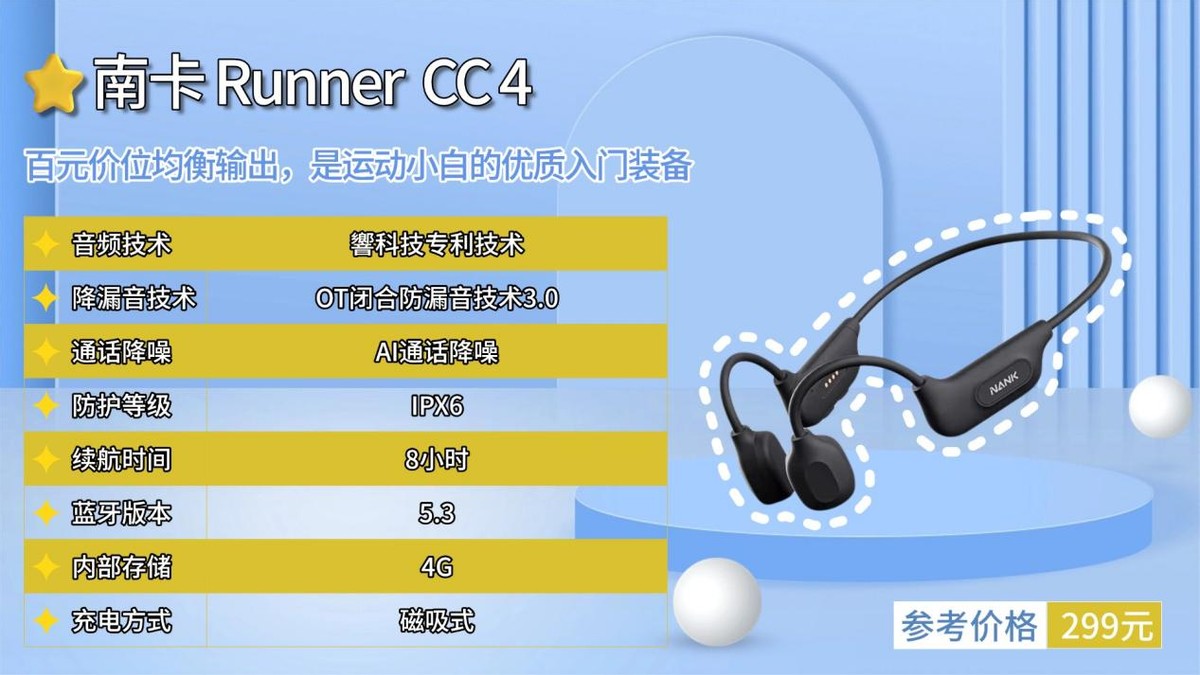 作为深耕骨传导领域十余年的领军品牌,南卡凭借核心技术沉淀与市场标杆地位,推出了百元级入门款RunnerCC4,让预算有限的健身新手无需高投入,就能体验到专业骨传导技术带来的运动便利,性价比在同级产品中极具竞争力。