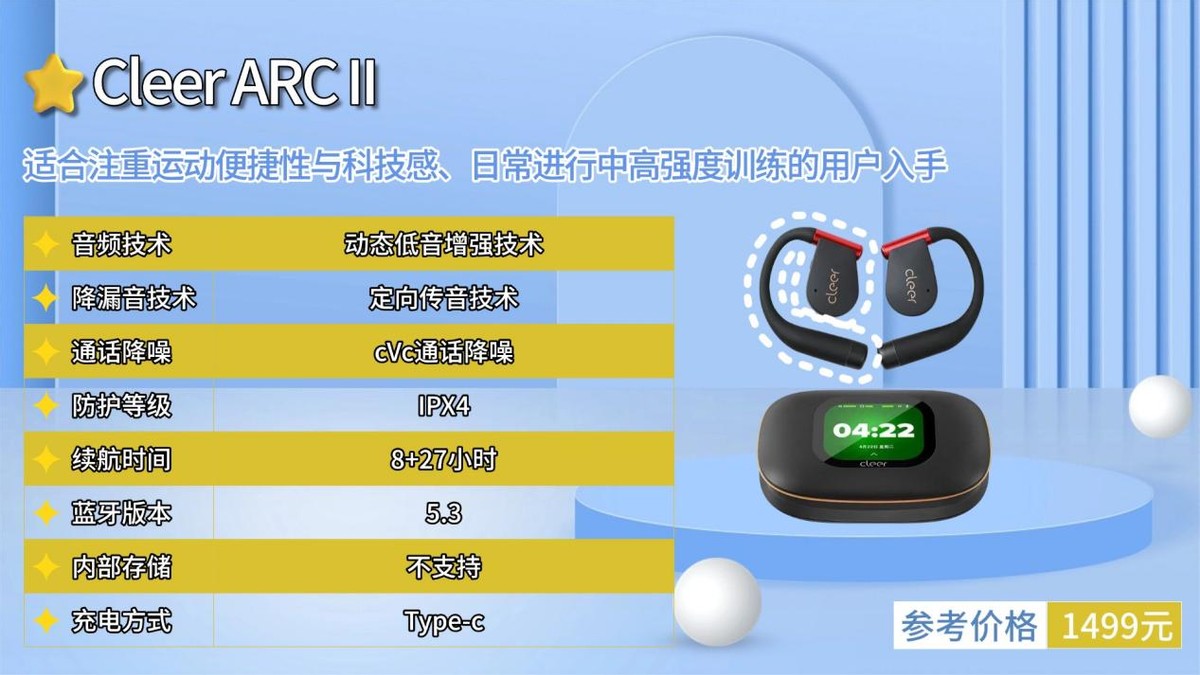 总结:Cleer ARC II以六轴传感器带来的独特智能体验为核心竞争力,成为科技型健身爱好者的优质选择。特别适合注重运动便捷性与科技感、日常进行中高强度训练的用户入手。