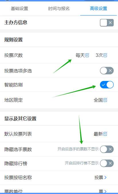 设置规则:每人每天可投几票?开启防刷机制软件,是否隐藏排名结果等。