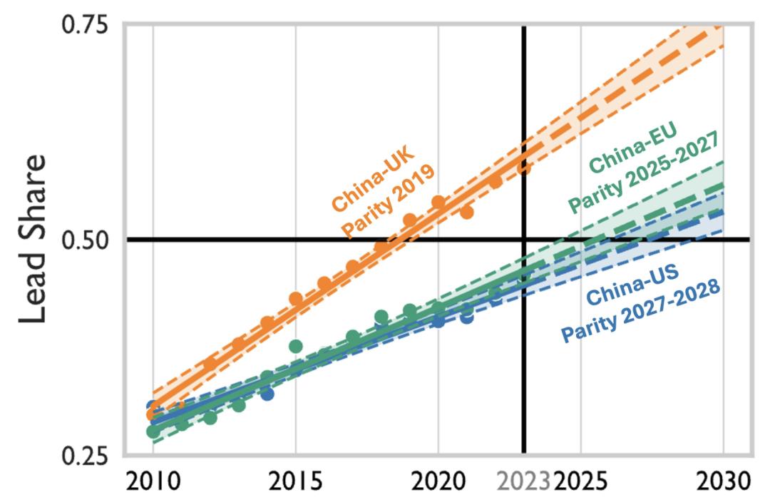 在绝对数量上,我国科学家,在研究中,处于领导者地位的这部分份额,在近10年间,从不到30%,增加到45%,预计2027年就能超过美国。