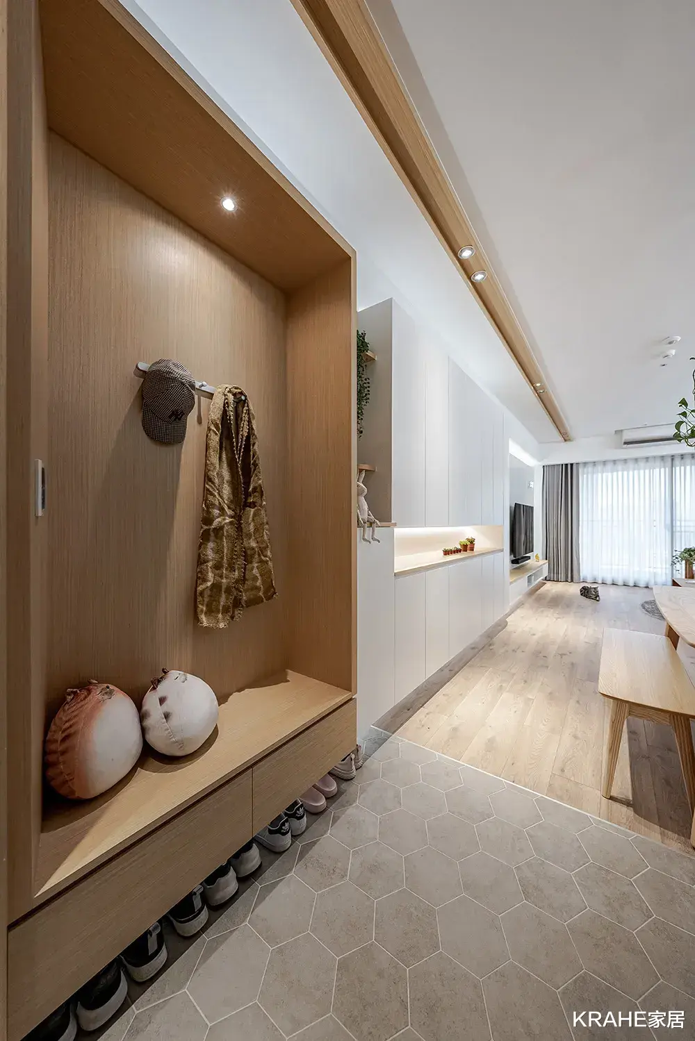 玄关设计玄关地面采用六角形灰色地砖铺设。