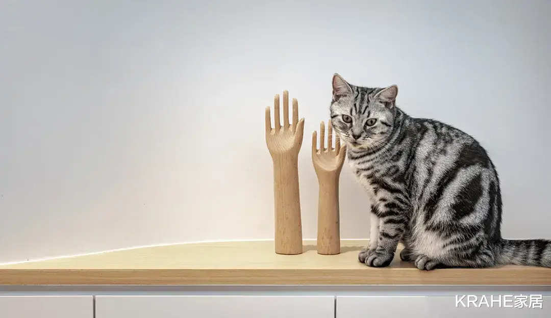 位于公共区域中心的餐桌,紧邻带插座的小吧台,这是主人与三五好友相聚吃火锅的地方。电器柜旁的空间,则是留给猫咪吃饭、喝水的地方。