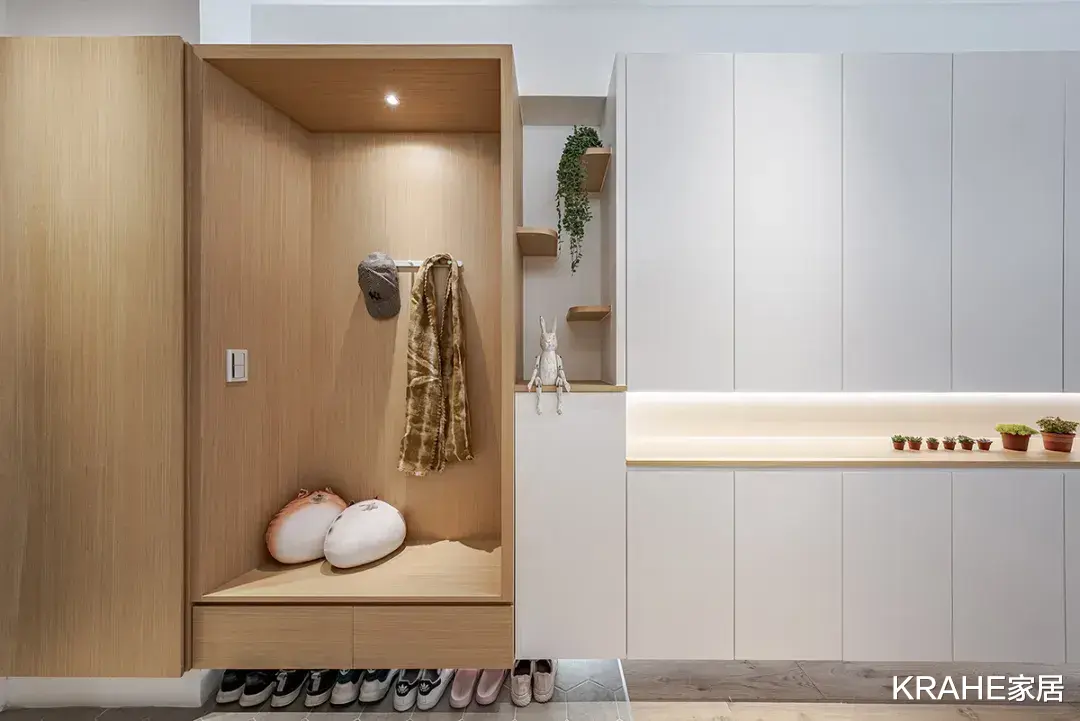设计了一个凹进去的平台,可以用来摆放穿鞋的椅子,座面宽大大且高度合适,方便妈妈来时脱鞋。