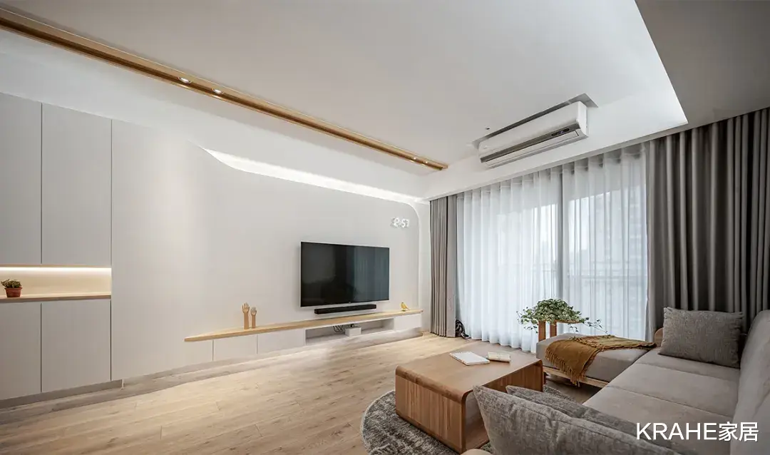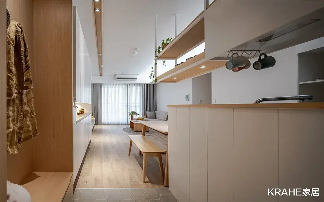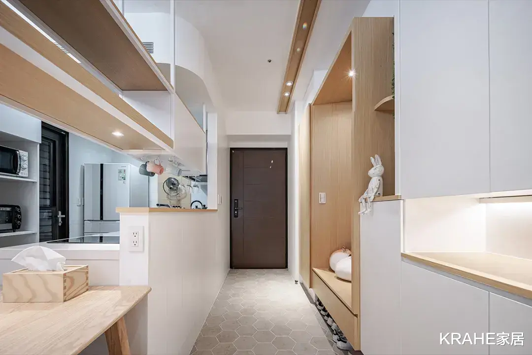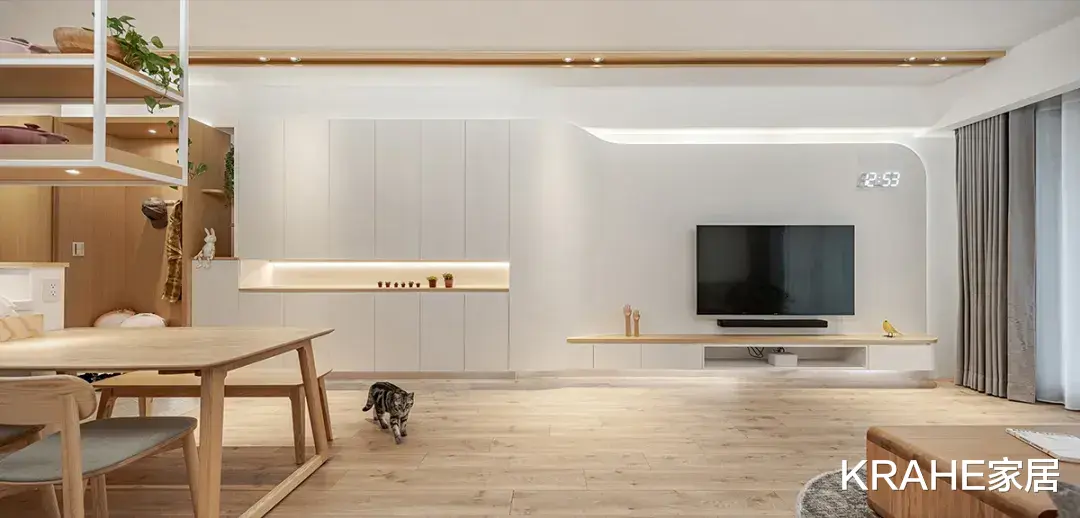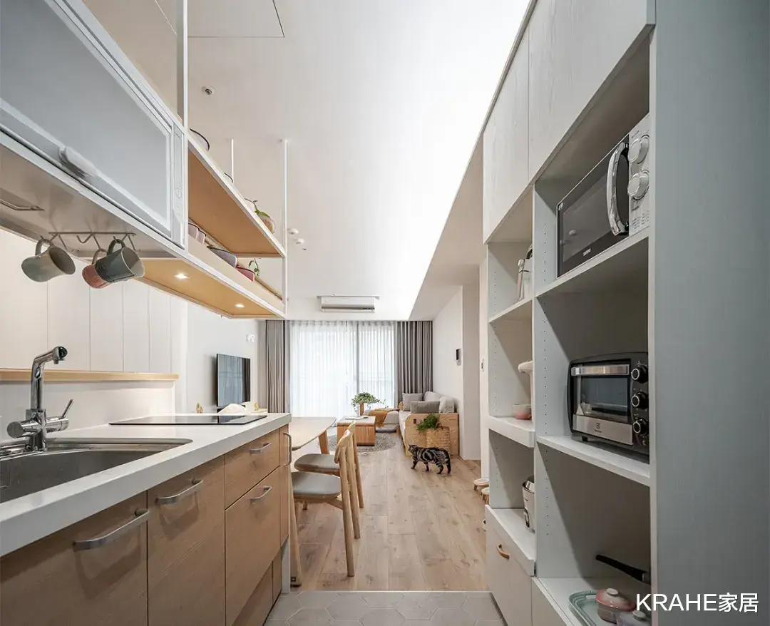 增加电器柜,让每样小家电都有归宿,保持整洁有序,以地面为为界,与客厅区域做出区分。