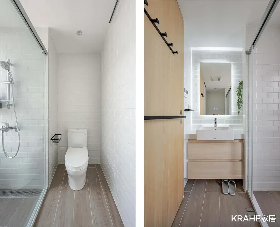 干湿分离的布局下,使用了木纹瓷砖和马赛克瓷砖,选择玻璃作为隔断,让空间保持明亮开阔。
