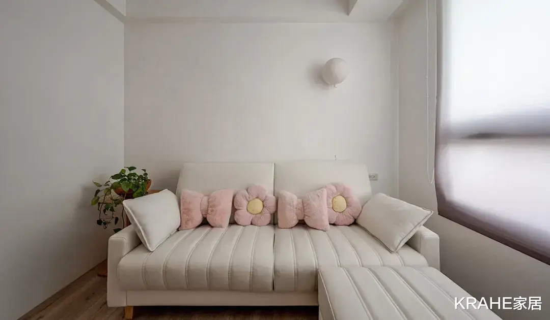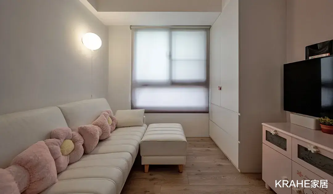 配有沙发床和简单的储物柜,使用妈妈喜欢粉嫩色系,用低饱和度的玫瑰粉色装饰,营造出甜美而不过分的氛围。