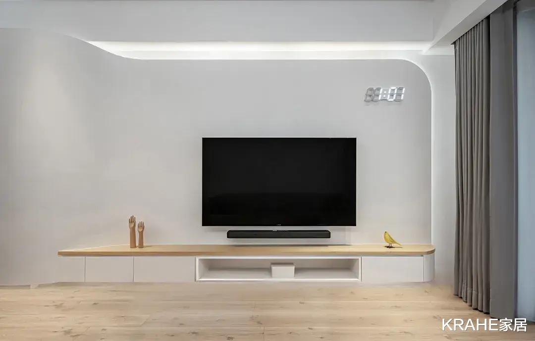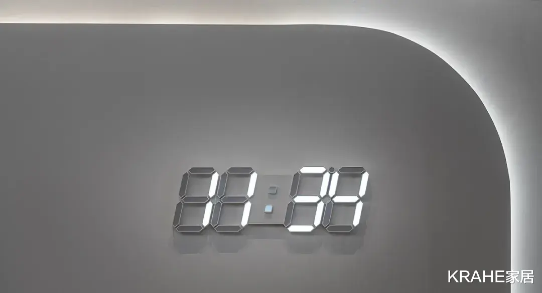其中一段曲面下面挂着主人挑选的壁挂式电子时钟,增强了现代科技感。
