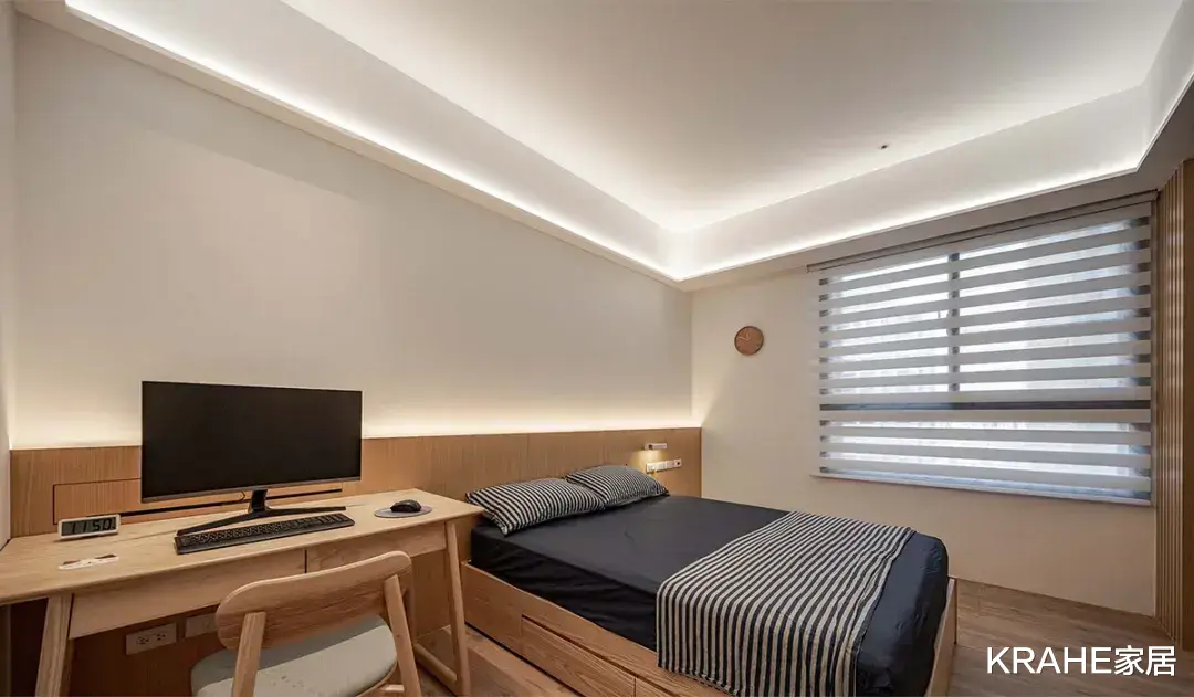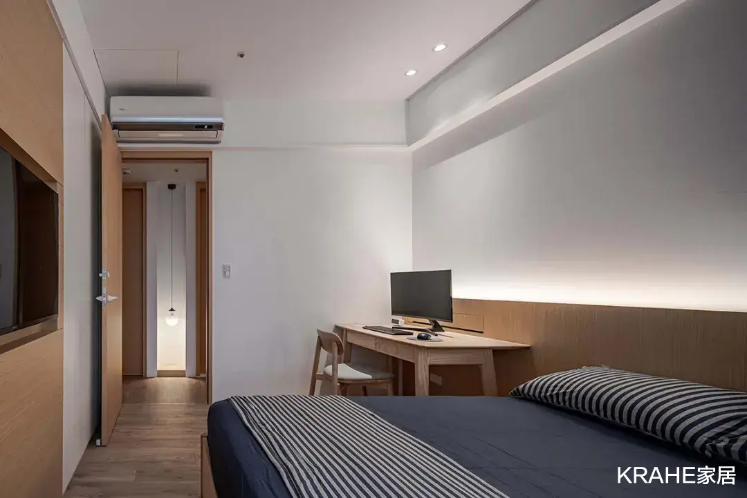 天花板上的灯条,形成口字型的间接光源,褐色床头背板也镶上笔直灯带,泛起柔和光晕,一侧悬挂壁灯,另一侧则是活动书桌,背墙上的线槽可收束电线等杂物。