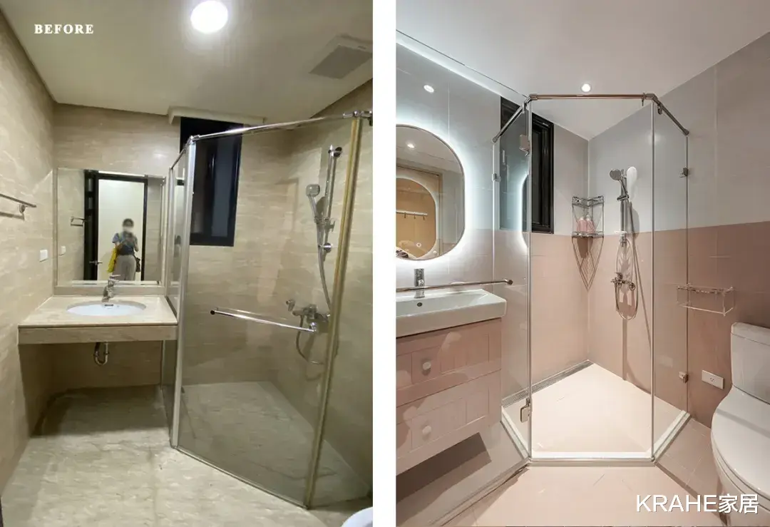客卫的风格偏向轻美式,带有一丝轻柔感,半高墙贴粉色砖,镜子边框加入灯带,泛起柔美的光晕。