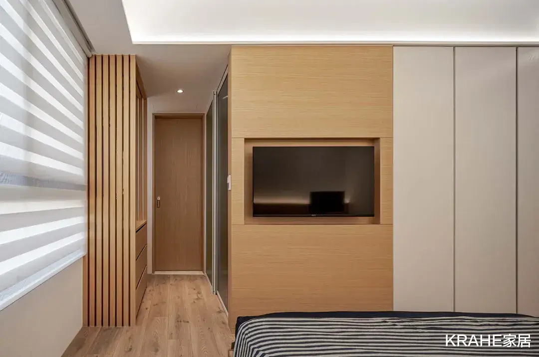 拆掉原有浴缸,将空间用作更衣室,充分利用每一寸空间,床尾端凹进去的定制柜悬挂电视墙。而墙后也有空间可放置电脑、大屏幕投影等电子设备。
