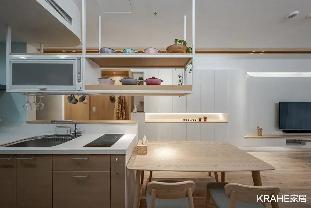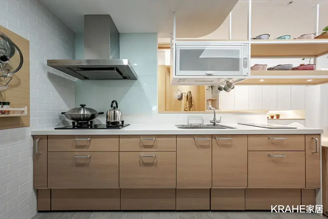 餐厨设计半高墙作为隔断,既可作为厨具的支撑,也让视野更开阔,连接其他区域,方便家庭成员间的对话交流。
