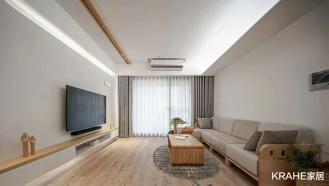 天花板上巧妙的设计了木质条状凹槽,与沙发后墙上的横梁保持了平衡。