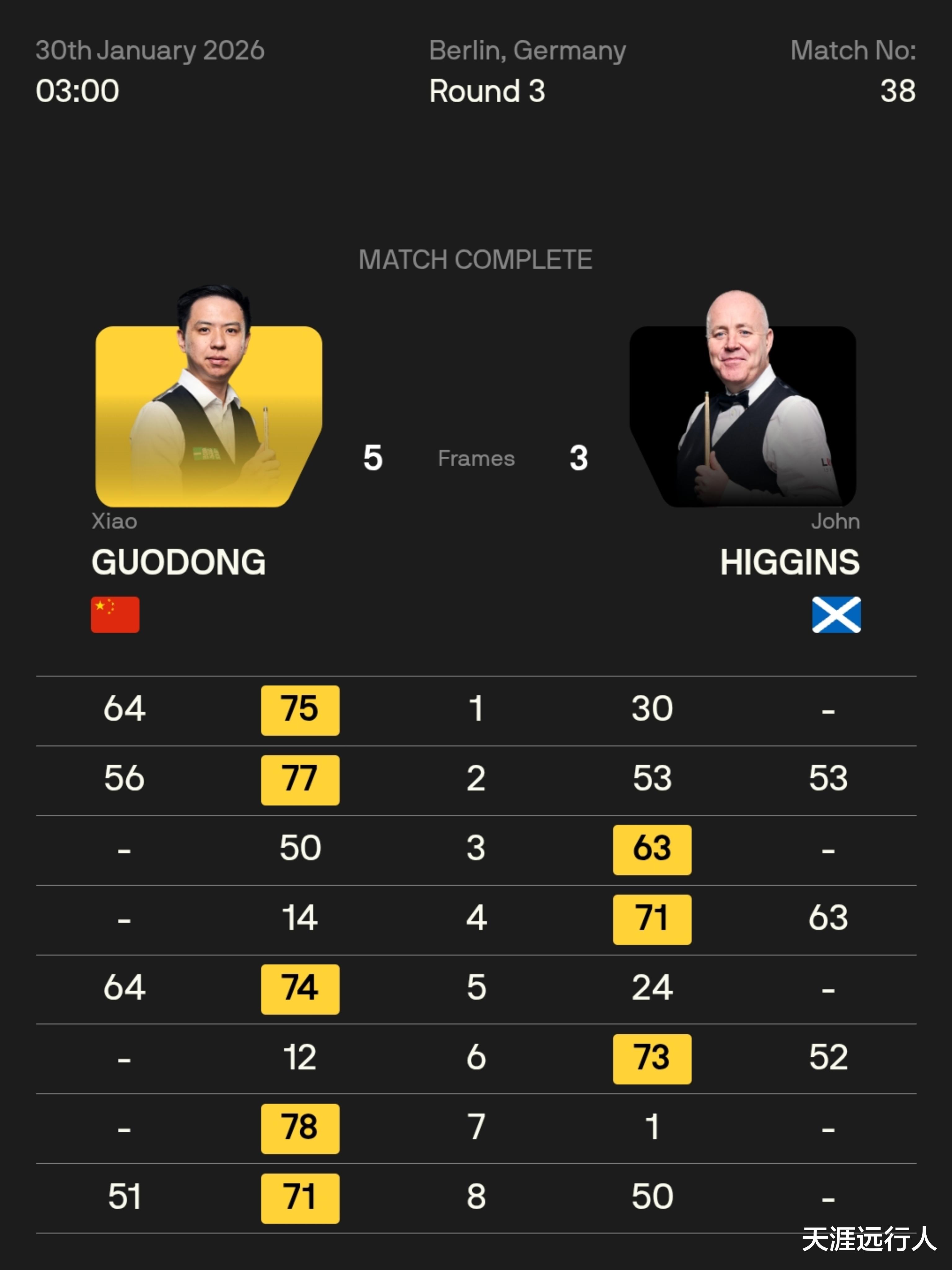 肖国栋全场打出四杆单杆50+,希金斯则打了三杆,国栋开场连下两城先声夺人,老张连扳两局追平,肖主播赢下第5局,重获领先,老张头再度扳平;肖国栋重压之下,连续拿下两局,5-3锁定胜利,代表中国军团独闯八强。