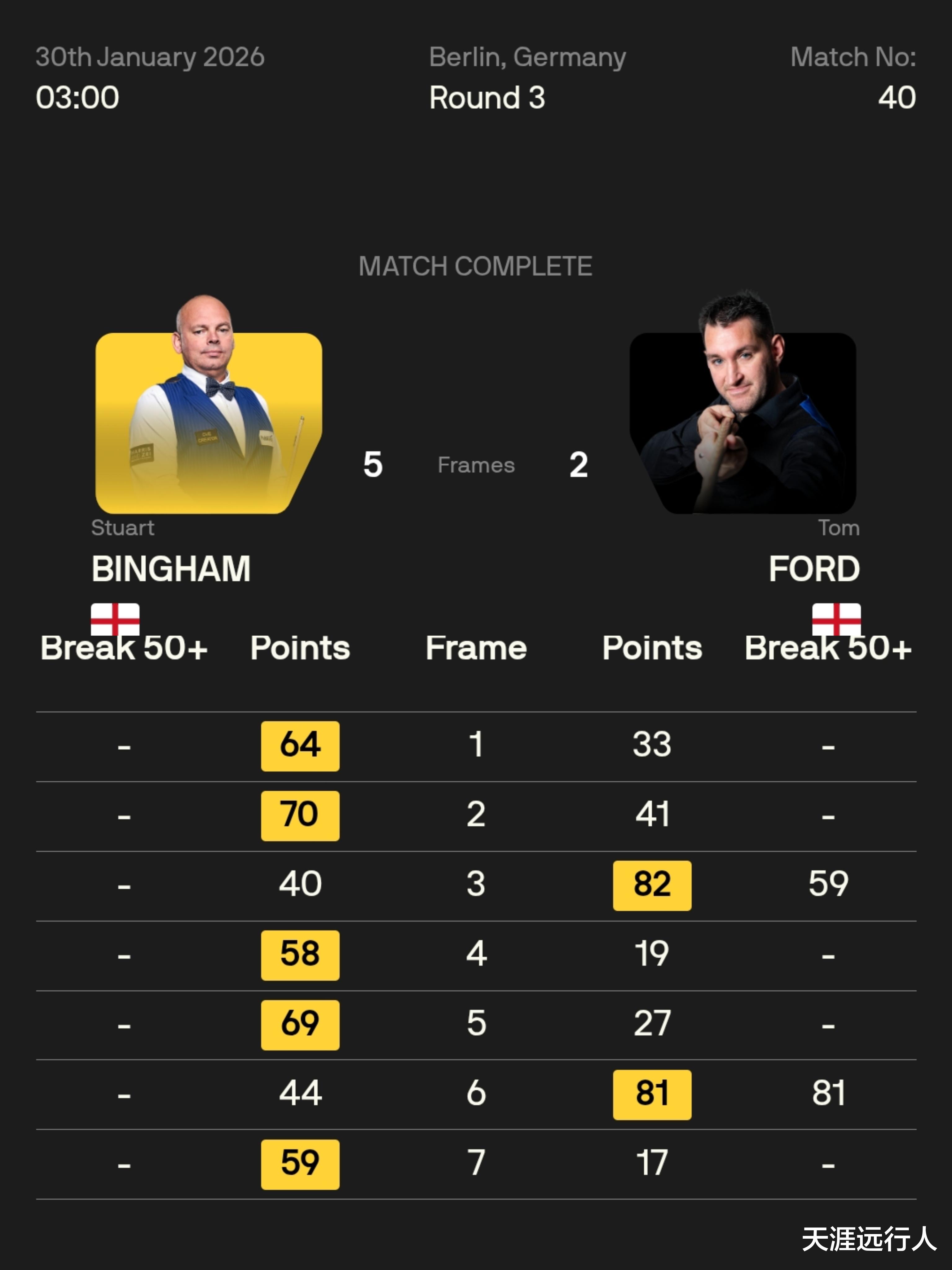 全场比赛,拥有九杆147的宾汉姆,居然一杆连续进攻也没有打出,靠两波两连击,先后以2-0、4-1领先,汤姆·福德打出59、81分两杆50+,赢下第3、第6局,最终斯图尔特·宾汉姆以5-2战胜汤姆·福德,杀进八强。