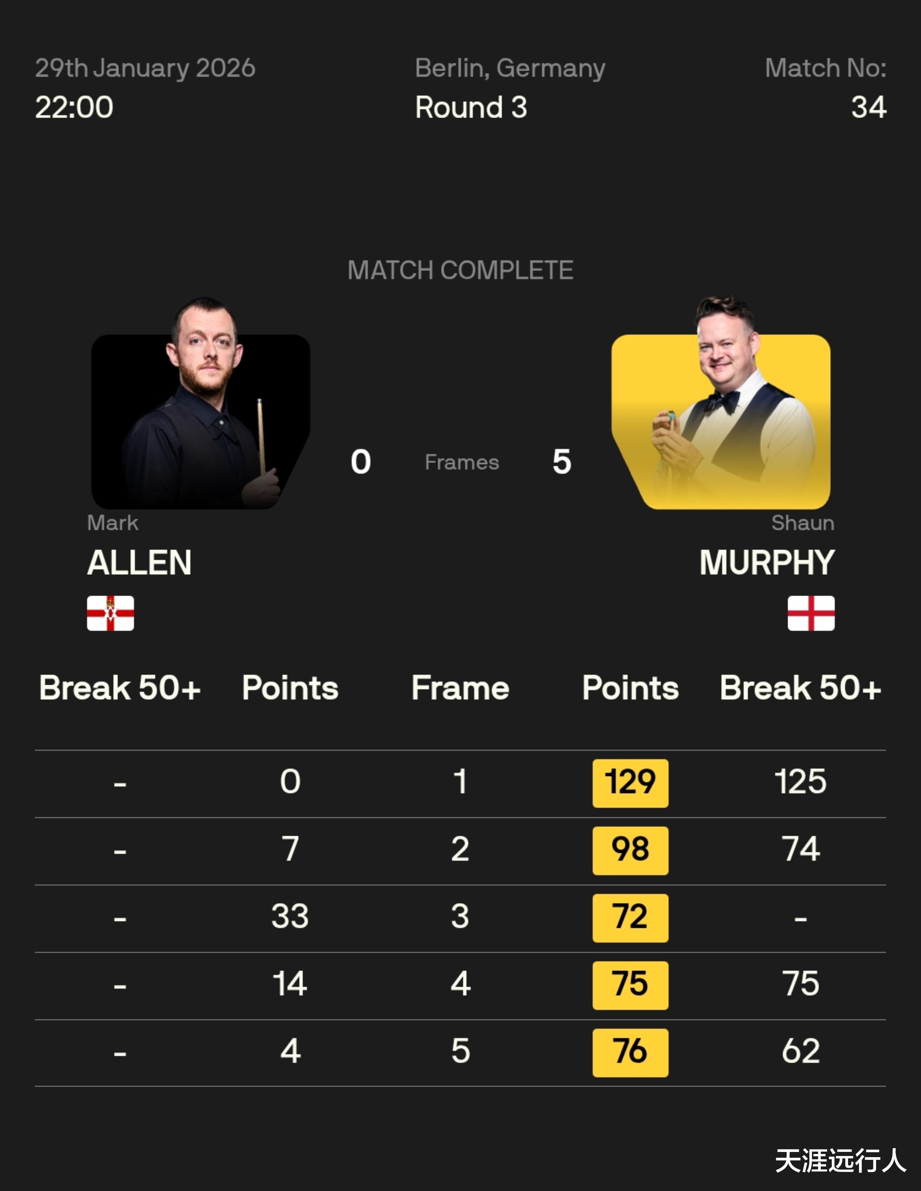 肖恩·墨菲全场打出一杆125分破百和74、75、62分三杆单杆50+,一轮五连击,连胜五局,以5-0横扫马克·艾伦,晋级八强。