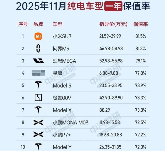 还有一个是中汽数研公布的11月份的结了电动车保值率,一年的话,小米SU7也是最高的,达到了81.5%。