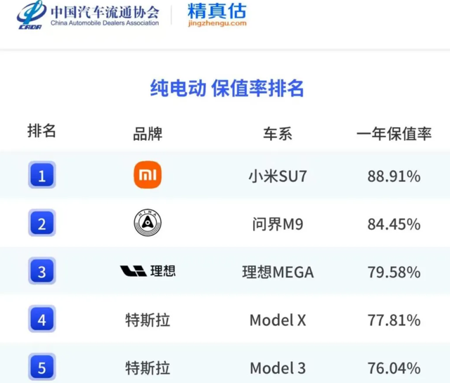 一个是中国汽车流通协会的数据,显示SU7一年的保值率高达88.91%,是所有纯电车中最高的。