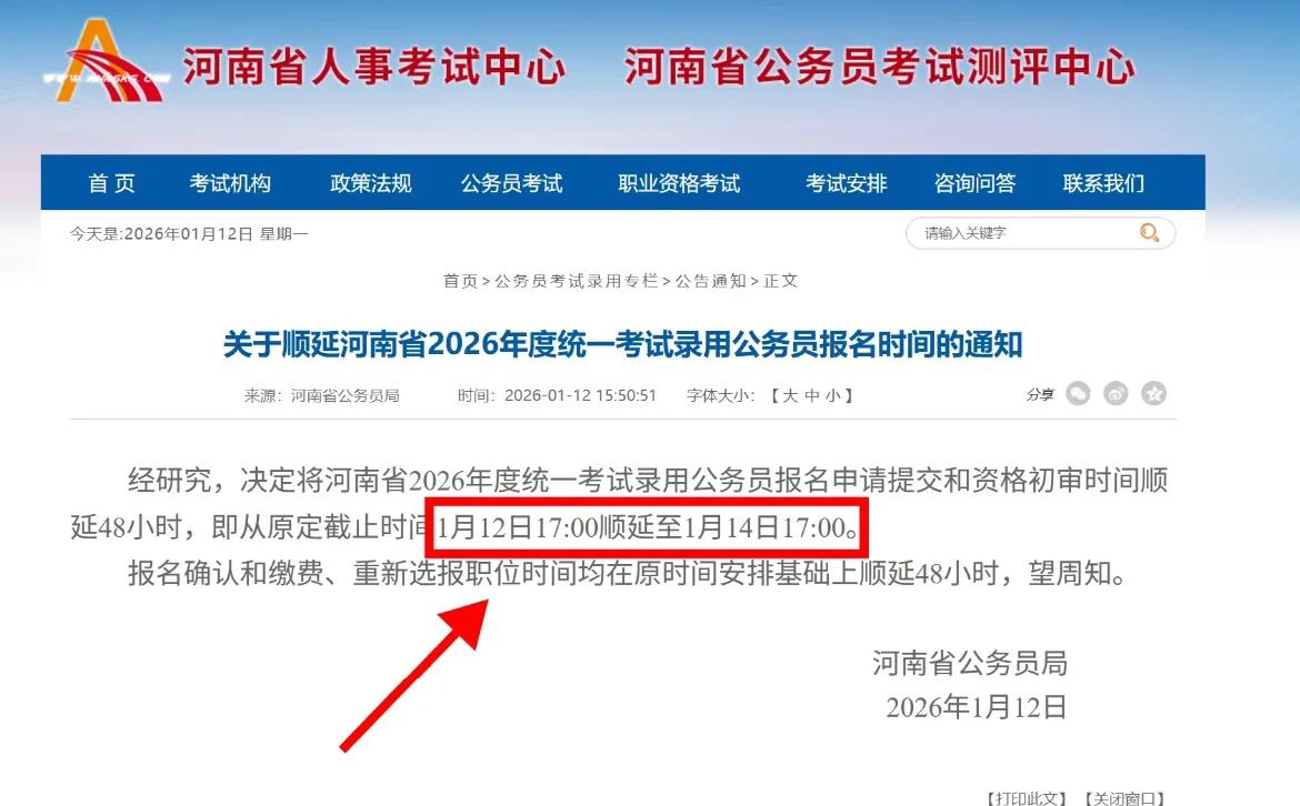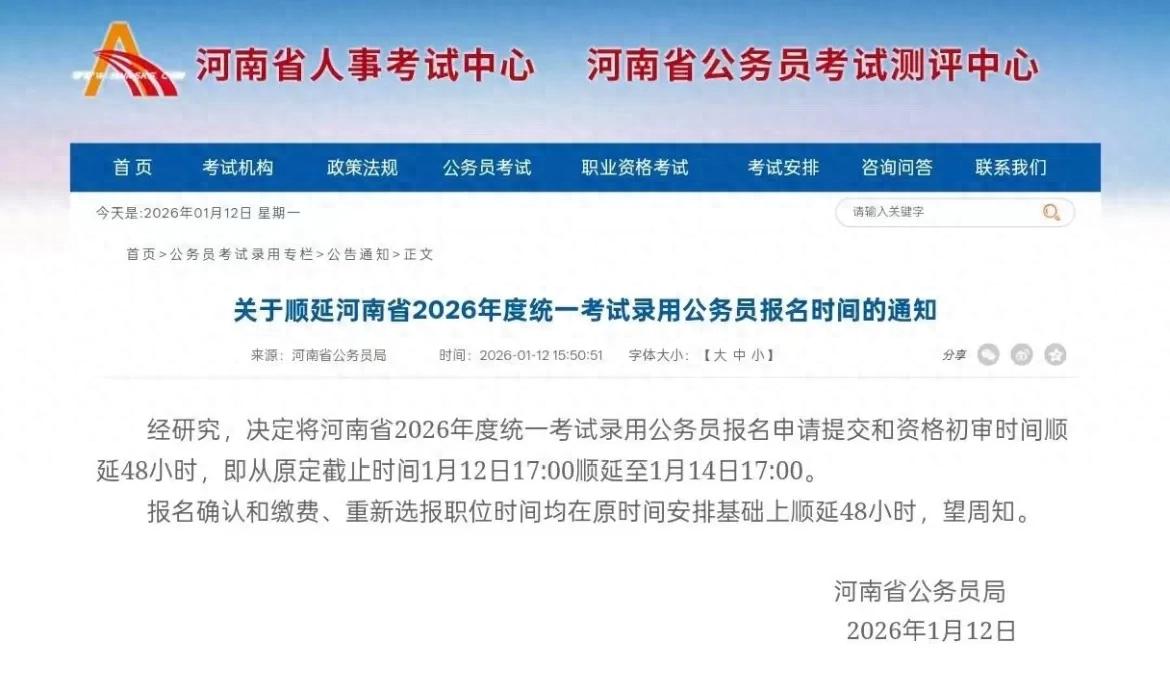 刚传来重磅消息!2026年河南省考报名紧急延期,给纠结未报、系统卡顿没提交成功的考生送上“定心丸”。