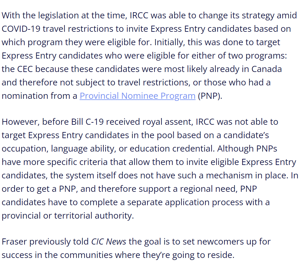 最近通过的Bill C-19法案允许移民部长根据当地经济发展的需要制定另外的邀请规则,对目标移民候选人发出邀请。这类新的邀请规则跟现在的分高邀请制不同,新的规则会根据移民候选人的职业、语言能力或教育背景来挑选合适的技术工人。换句话说即使你的CRS总分不高,但只要你的职业是加拿大劳动力市场所需要的,并且你的语言能力或教育背景都符合要求的话,你也是有可能获得邀请的。目前移民局正在跟利益相关者公开协商、讨论新的邀请机制,并准备在明年2023年的第一季度做好技术方面的准备工作并开始按照新的邀请规则对申请人发出邀请信。