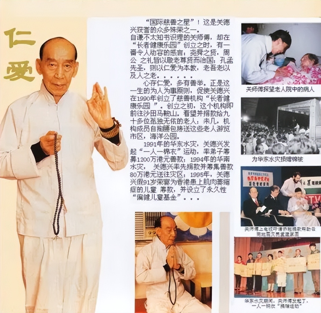 晚年的关德兴,将所有的精力都放在慈善事业,1990年,他回到香港成立了“长者健康园”,1991年的“华东水灾”,关德兴与团队筹集了1200万善款,之后的华南水灾,他又筹集了80万港元捐到灾区。