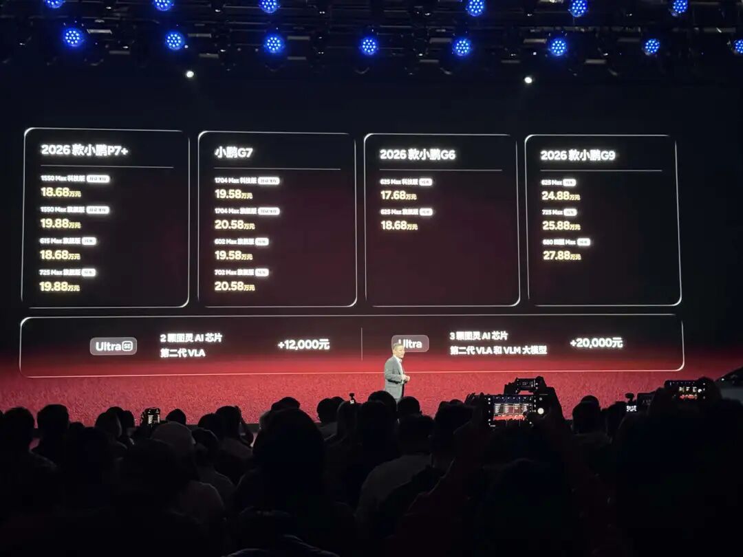 其中,2026款小鹏P7+纯电版与增程版同价,共四个版本,售价18.68万元起;小鹏G7纯电版与增程版同价,共四个版本,售价19.58万元起;2026款小鹏G6共有两个版本,17.68万元起;2026款小鹏G9共有三个版本,起售价24.88万元。