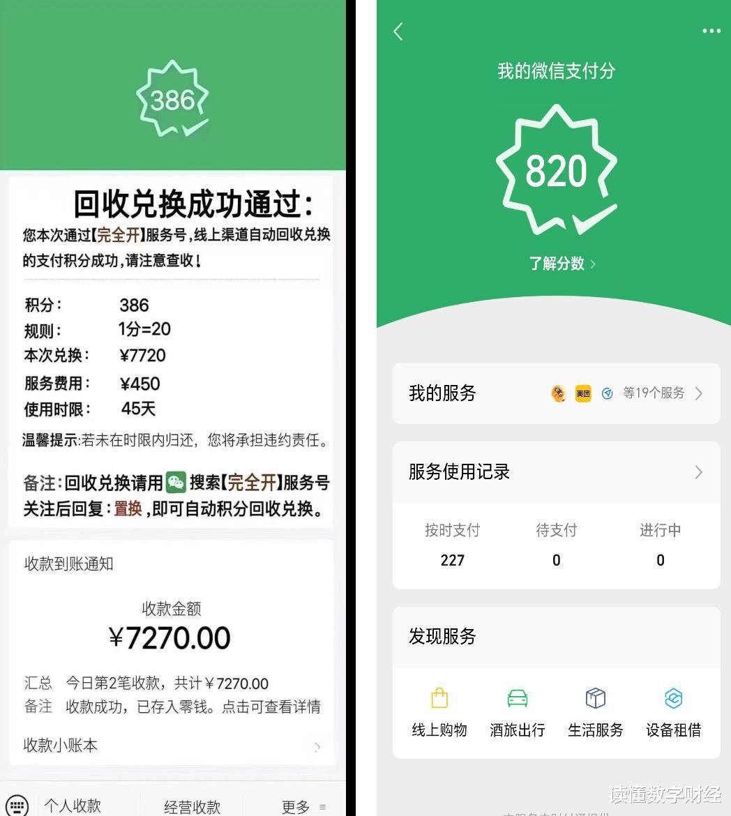 连续两个微信用户在评论区发布了同一张图片,图片中有几个关键词:“【完全开】服务号”、“回收兑换”、“支付积分”、“一分=20”、“收款金额”等,支付积分是什么分呢?