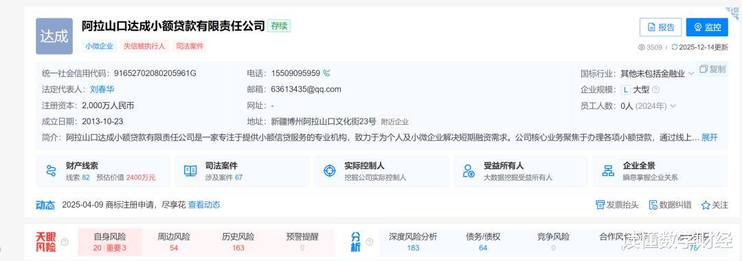 一个一个说,天眼查信息(2月13日查询)显示,达成小贷为失信被执行人,注册资本仅2000万元,法定代表人为刘春华,且员工人数为0人。