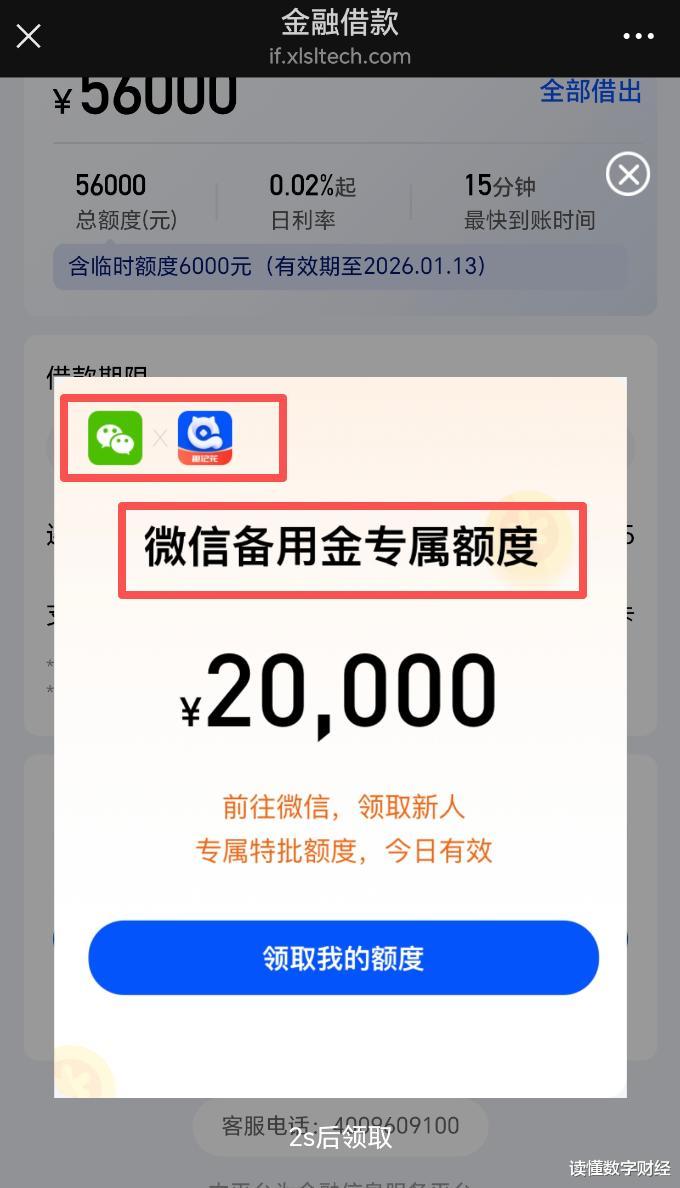 这些账号有一些特性:注册地或IP属地各不相同,但都在账号的菜单栏建立了三个借款入口,其中一个入口指向了名为“乐小钱”的产品,《读懂数字财经》从另外一个入口退出后,弹出了一个页面,该页面有明确的“微信备付金专属额度”字样,且还有内容暗示:微信与“趣记花”合作。