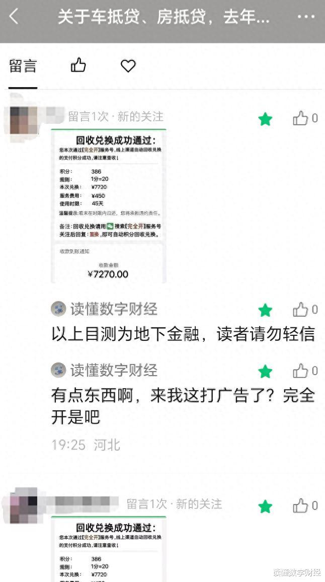 1、面对当前车抵贷的火热,《读懂数字财经》秀了下去年7月的预判文,万万没想到,留言区被人当成了获客通道。