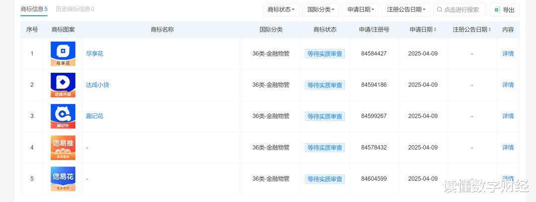 虽然,以达成小贷为主体注册的公众号多达几十个,但是该公司在天眼查只有5个商标信息,分别为:尽享花、达成小贷、趣记花以及借易推和借易花。