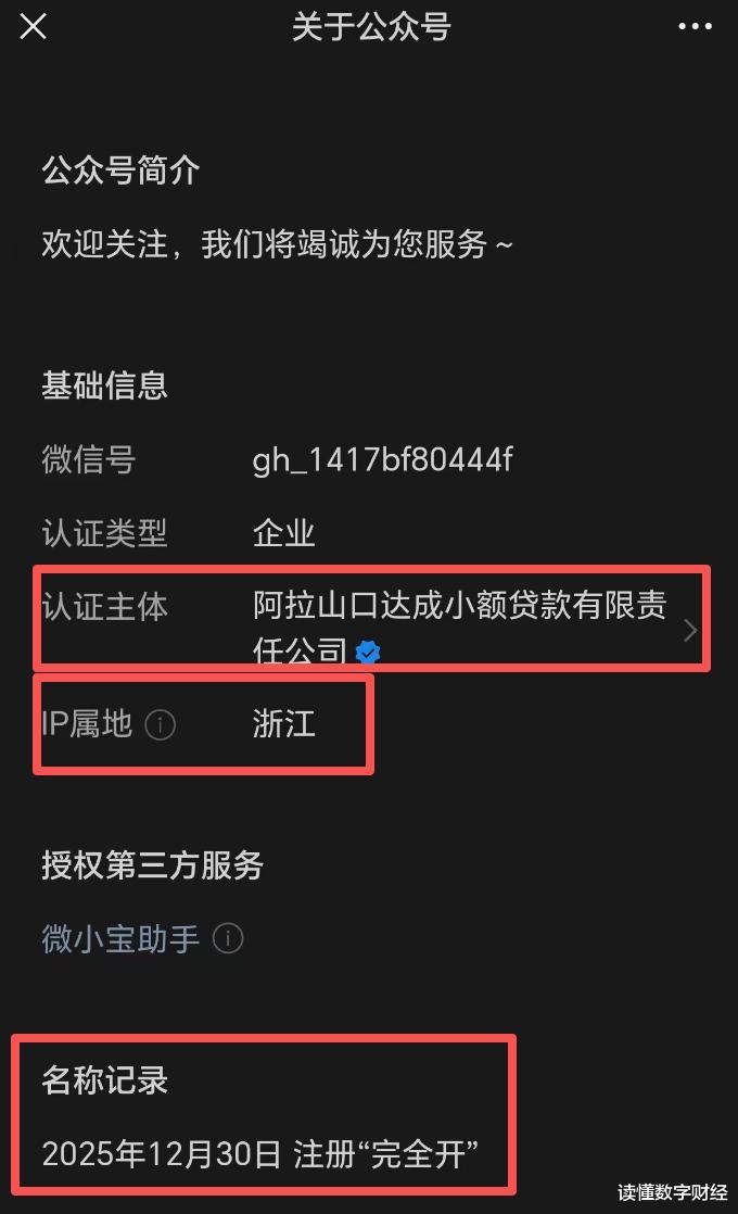 通过查询可知,微信上确实有名为“完全开”的服务号,其认证主体为“阿拉山口达成小额贷款有限公司”(下称“达成小贷”)。