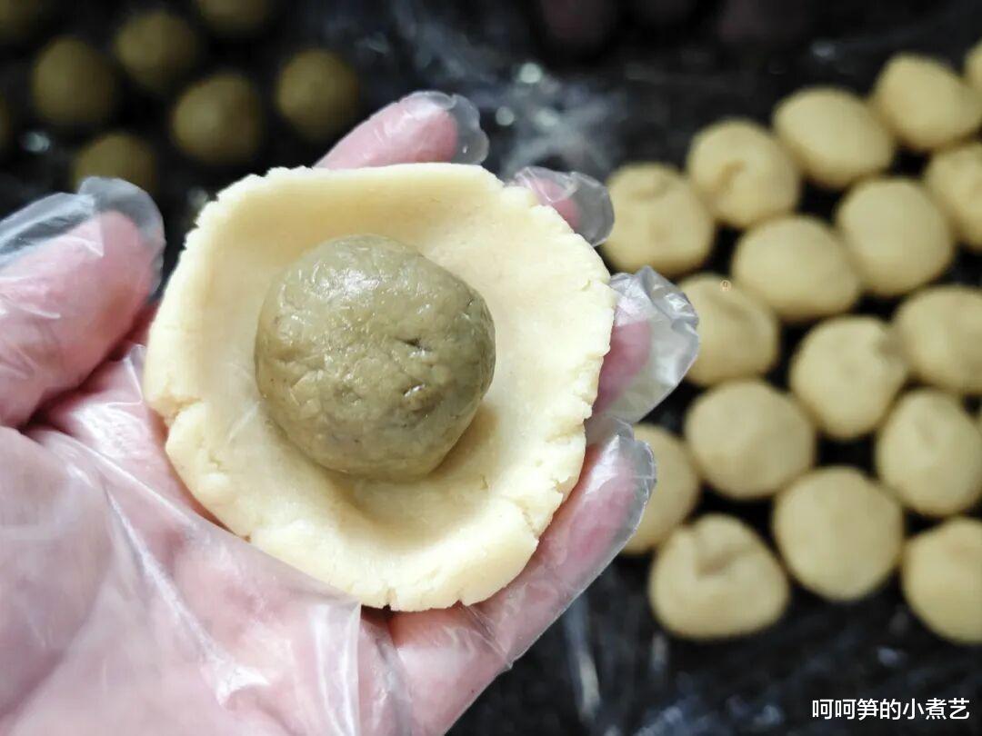 取一个白芸豆饼球压扁,放入一个绿豆沙或红豆沙馅。